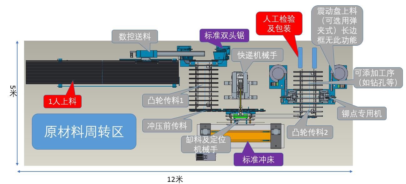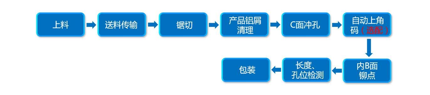 本光伏邊框生產線將機器人的智能化引入、融進該項加工工藝,為用戶生產需求量身定制。由送料傳輸、鋸切、C面沖孔、自動上角碼、內B面鉚點、長度、孔位檢測、包裝等工序組成。該光伏邊框生產線可以由傳統(tǒng)沖壓線及標準鋸切機及常用模具配合自動上料鋸切,下料機器人沖壓及自動上角碼,鉚點及下料等工序組成,結合了手工線的優(yōu)勢,并采用機器人及智能傳料。并采用總線控制運動控制系統(tǒng),滿足制造工藝的自動化控制要求,實現(xiàn)高效率、高精度,實現(xiàn)全自動化。為光伏邊框生產廠家所面臨的自動化程度低、產品質量不穩(wěn)定、作業(yè)人員工作強度大等問題提供了智能自動化解決方案。